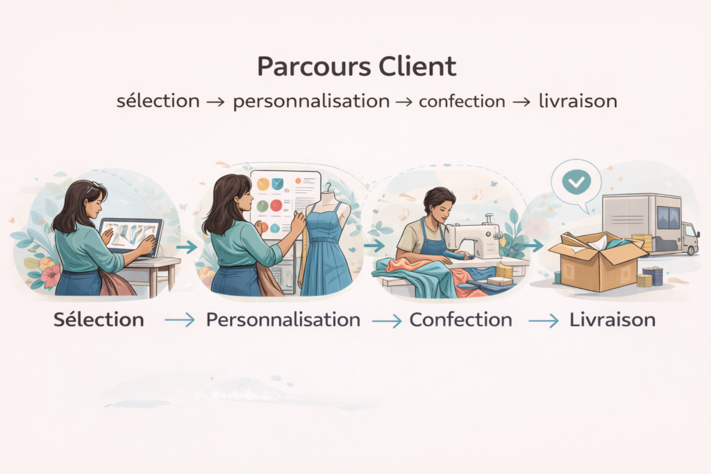 - Un parcours client clair : sélection → personnalisation → confection → livraison